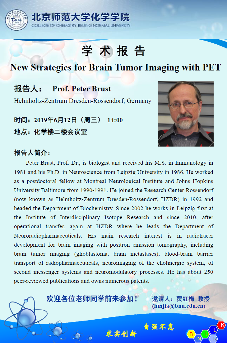 学术报告:Helmholtz-Zentrum Dresden-Rossendorf,Prof. Peter Brust,New Strategies for Brain Tumor Imaging with PET