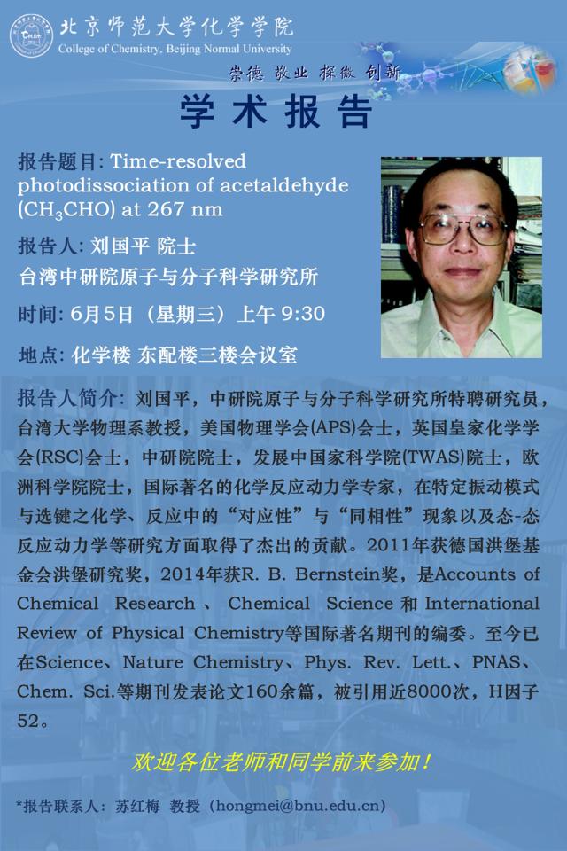 学术报告:台湾中研院原子与分子科学研究所,刘国平 院士,Time-resolved photodissociation of acetaldehyde (CH3CHO) at 267 nm