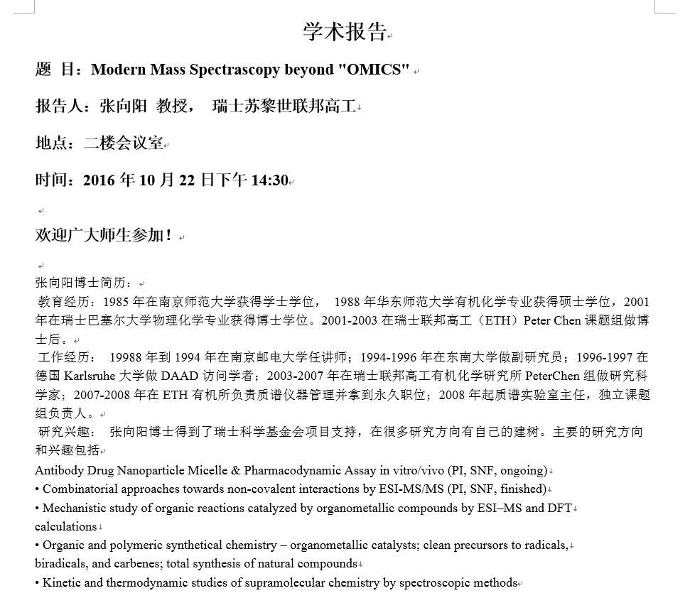 学术报告:瑞士苏黎世联邦高工,张向阳 教授,Modern Mass Spectrascopy beyond "OMICS"