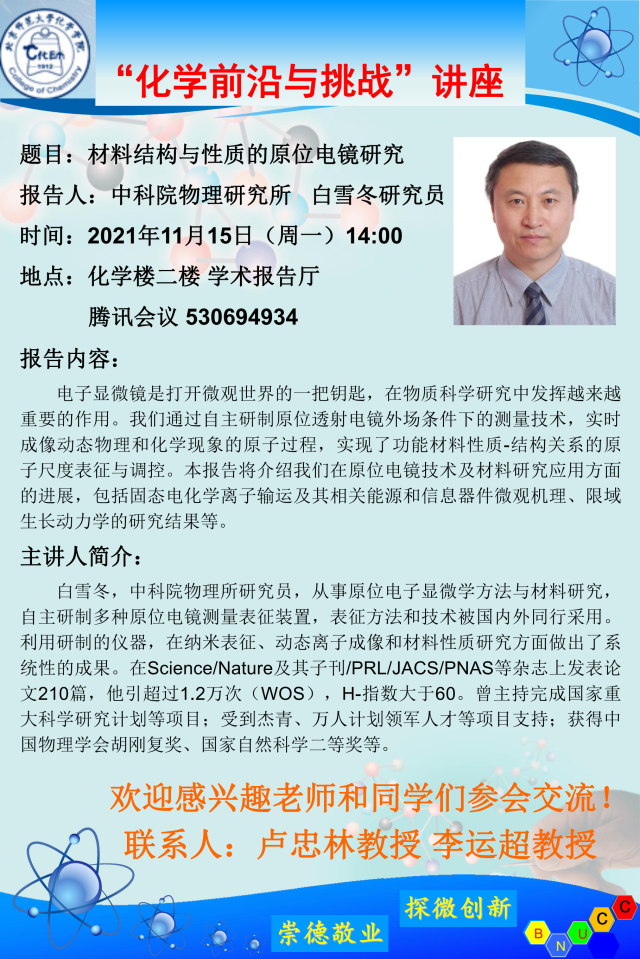 学术报告:中科院物理研究所,白雪冬研究员,材料结构与性质的原位电镜研究