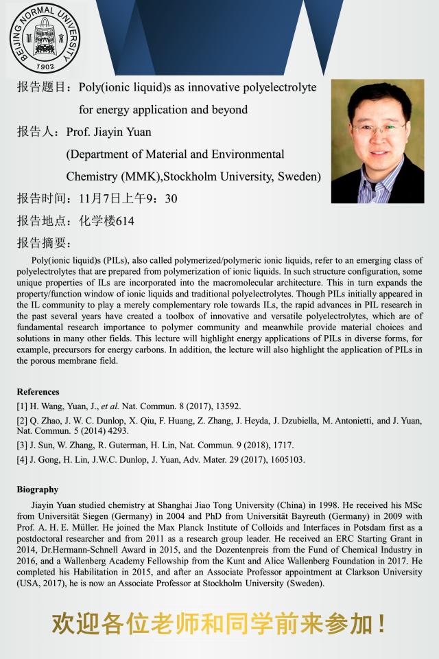 学术报告:Stockholm University,Prof.Jiayin Yuan,Poly (ionic liquid)s as innovative polyelectrolyte for energy application and beyond