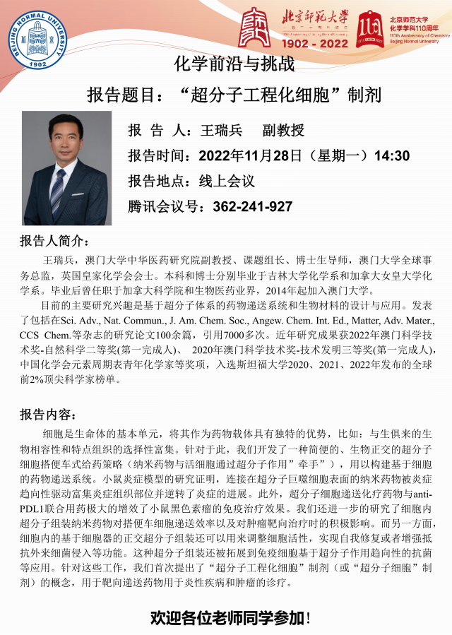 学术报告:澳门大学,王瑞兵副教授, “超分子工程化细胞”制剂