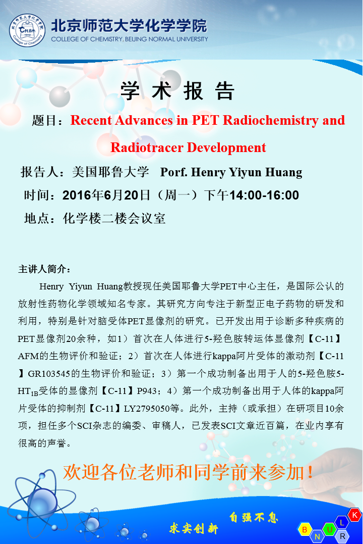 学术报告:美国耶鲁大学 Porf. Henry Yiyun Huang,Recent Advances in PET Radiochemistry and Radiotracer Development