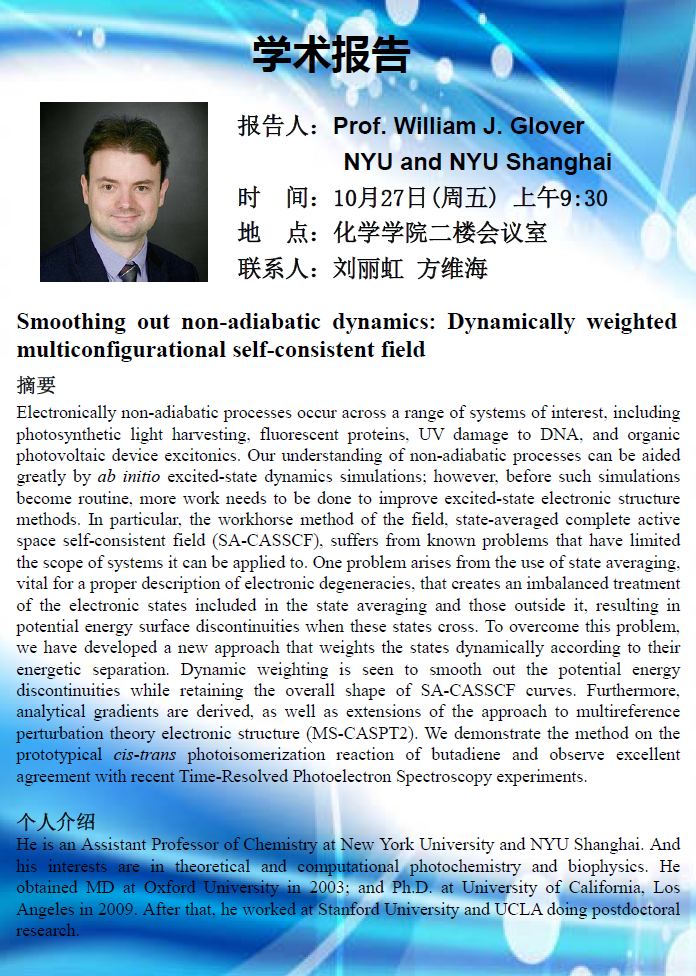 学术报告:纽约大学&纽约大学(上海)William Glover教授,Smoothing out non-adiabatic dynamics: Dynamically weighted multiconfigurational self-consistent field