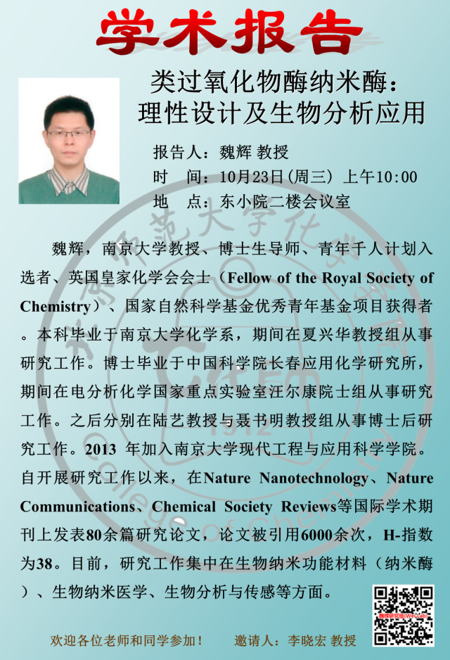 学术报告:南京大学,魏辉教授,类过氧化物酶纳米酶:理性设计及生物分析应用