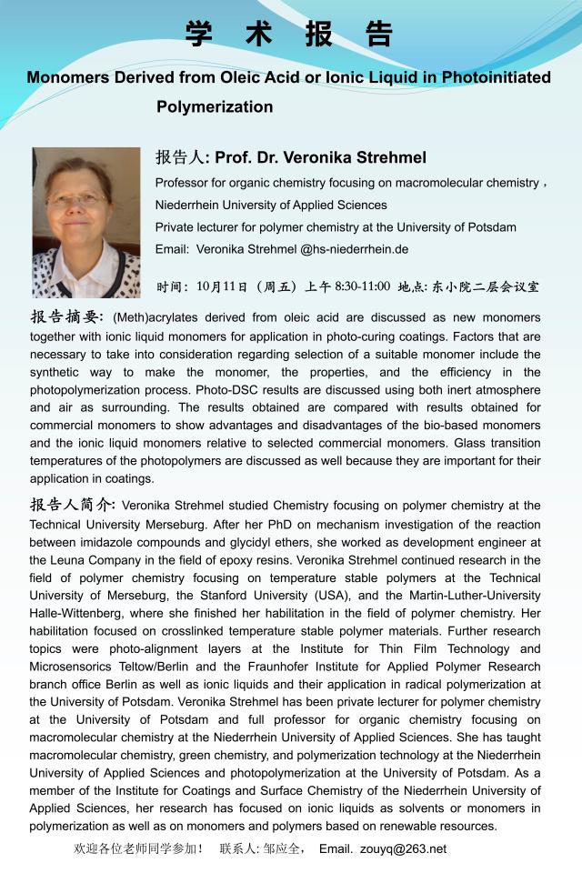 学术报告:Prof. Dr. Veronika Strehmel,Monomers Derived from Oleic Acid or Ionic Liquid in Photoinitiated Polymerization
