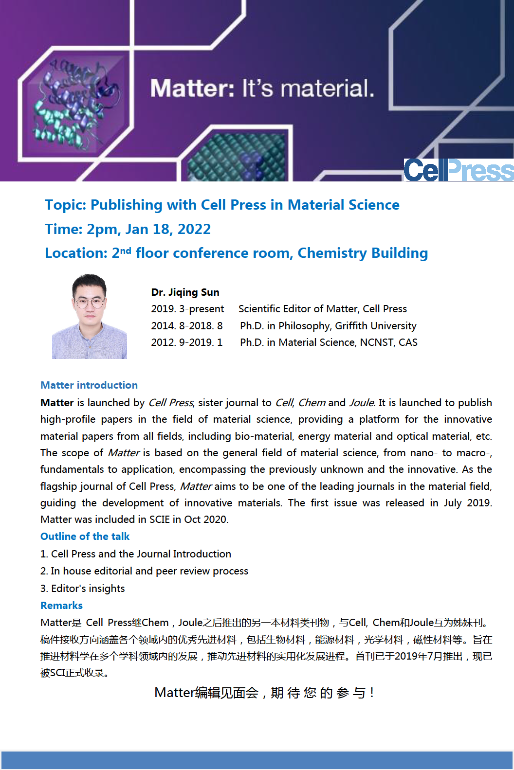 学术报告:Matter编辑,Dr. Sun Jiqing,Publishing with Cell Press in Material Science