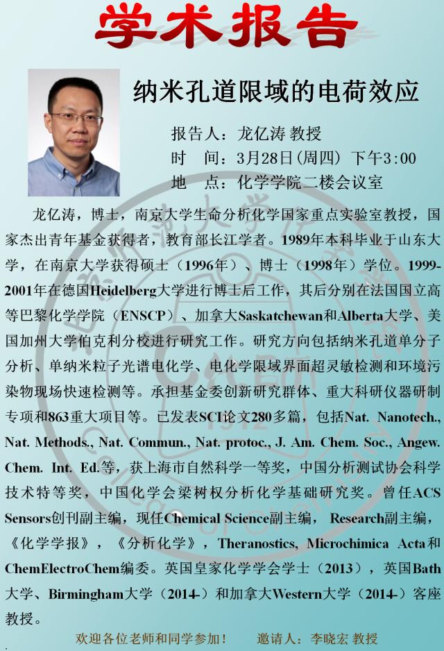 学术报告:南京大学,龙亿涛教授,纳米孔道限域的电荷效应