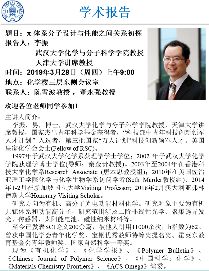 学术报告:武汉大学化学与分子科学学院,李振教授,π体系分子设计与性能之间关系初探