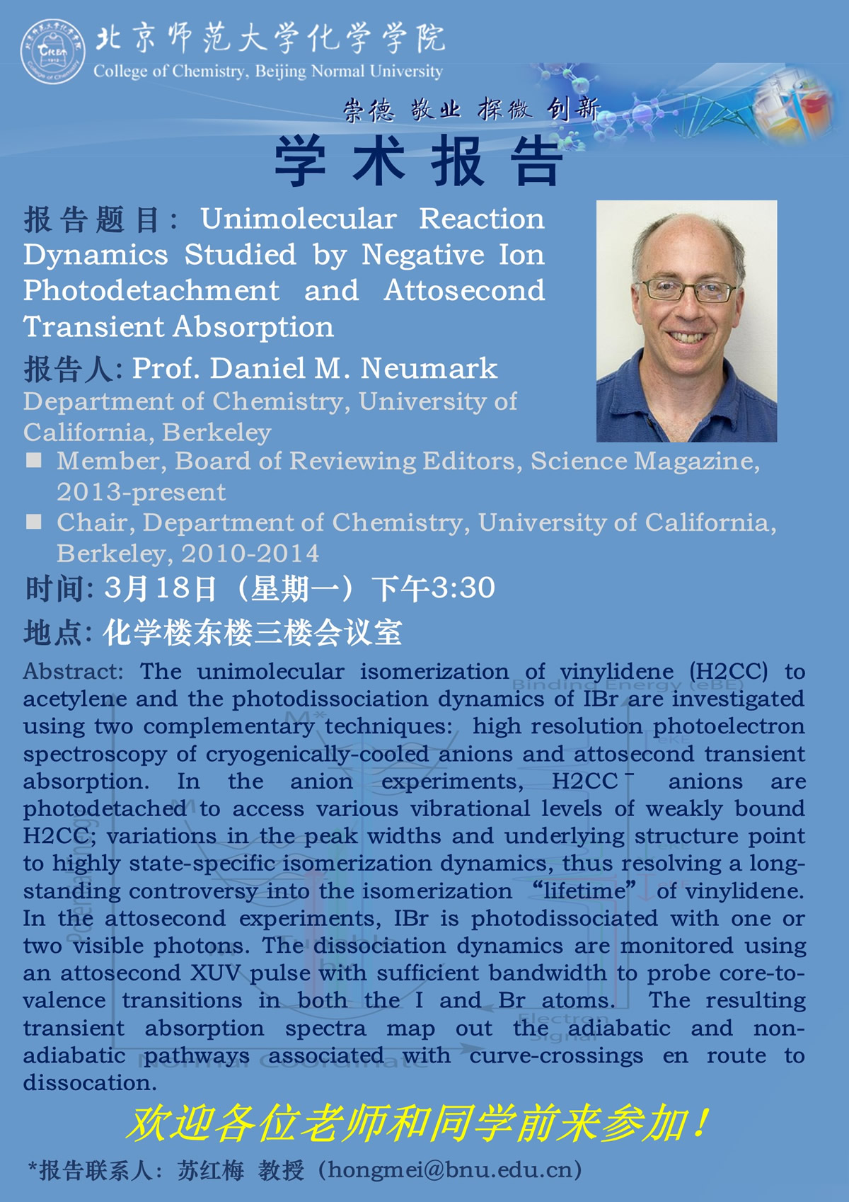 学术报告:University of California,Prof. Daniel M. Neumark,Unimolecular Reaction Dynamics Studied by Negative Ion Photodetachment and Attosecond Transient Absorption