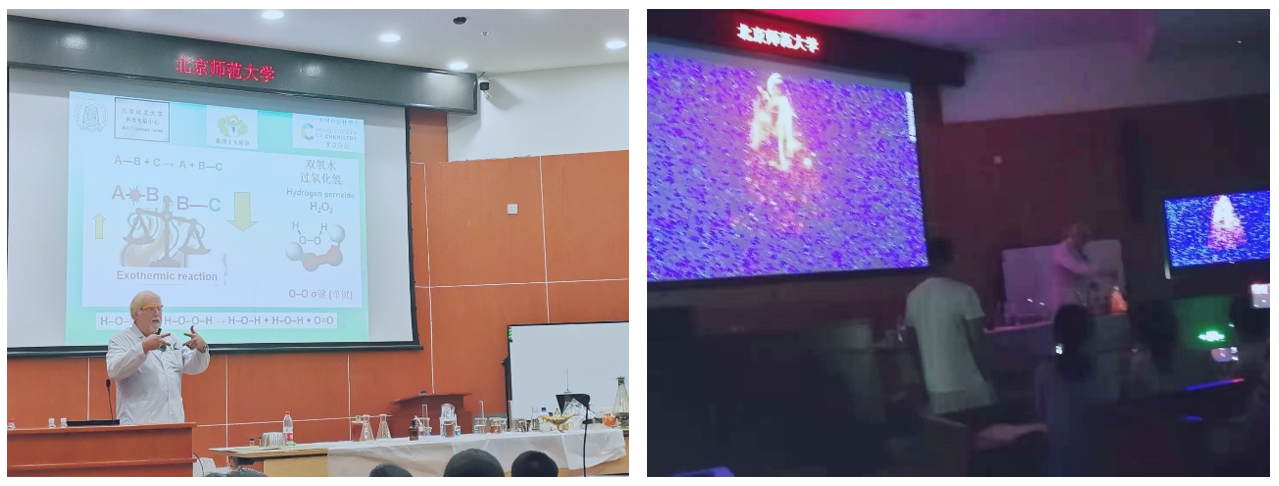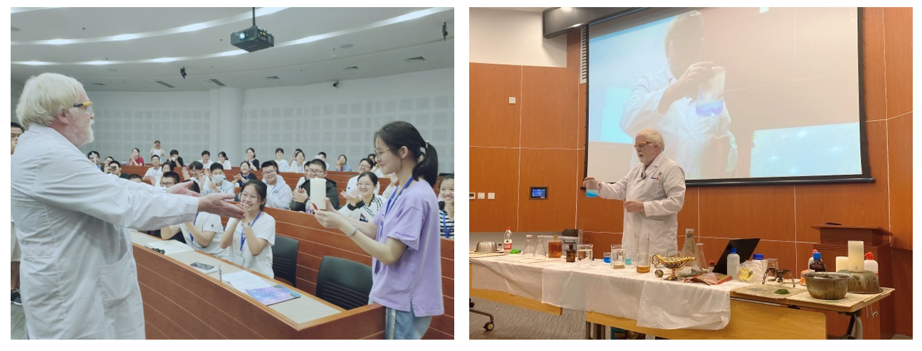 7月18日晚上,科普“网红”David教授以“化学在哪里,化学无处不在”为主题开展了化学科普讲座。David教授从双氧水的结构性质说起,为同学们演示了一些由双氧水参与的奇妙反应,也通过系列有趣的实验向大家论证了催化剂在化学反应中的作用效果和作用机理,用趣味实验将深奥的化学原理展现给大家。课堂互动频繁,现场欢笑声不断,掌声热烈而持久,极大地激发了同学们对化学学习的兴趣。