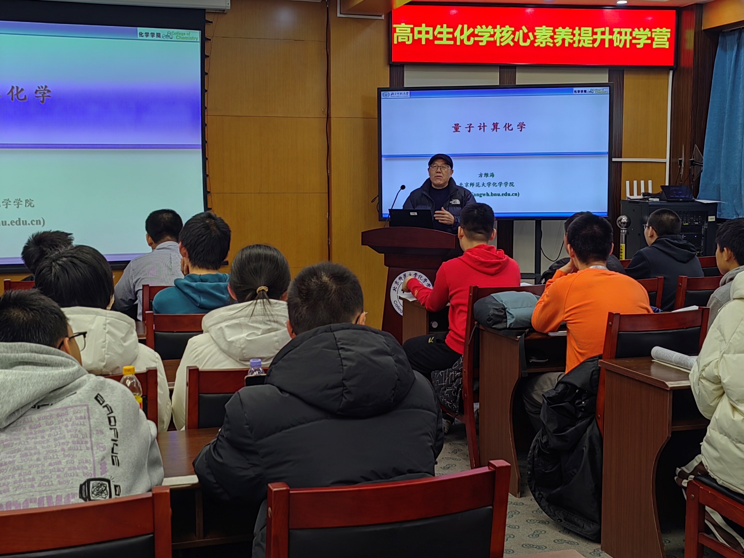 第一天的课程围绕结构化学主题展开。上午,陈光巨教授讲授了“体验探索发现物质结构-性能的魅力奥秘和关系”的理论课程,从“宏微-衡变-证模”、“结构-性质-育学教”、“发展-创新-未来”三个角度带领学生们进行学习,梳理高中化学 “原子结构”、“微粒间相互作用与物质性质”、“物质的聚集状态与物质性质”等内容,讲解五大化学学科核心素养之间的内在关系,培养学生们从微观层面研究物质的思维方式。下午,同学们学习了两种重要的结构表征的工具,单晶和核磁,邓学彬老师和乔晋萍老师从结构测定原理、仪器构造、测试方法等向同学们进行了讲解和实操演示。晚上,中国科学院方维海院士做了题为“量子计算化学”前沿报告,报告深入浅出地讲解了量子化学的基本知识和量子计算机的基本原理,报告旁征博引,并通过实例鼓励同学们高水平的科研工作不是遥不可及的,创新性成果的关键是坚实的理论和实验基础,引导同学们善于发现问题,坚持不懈努力。
