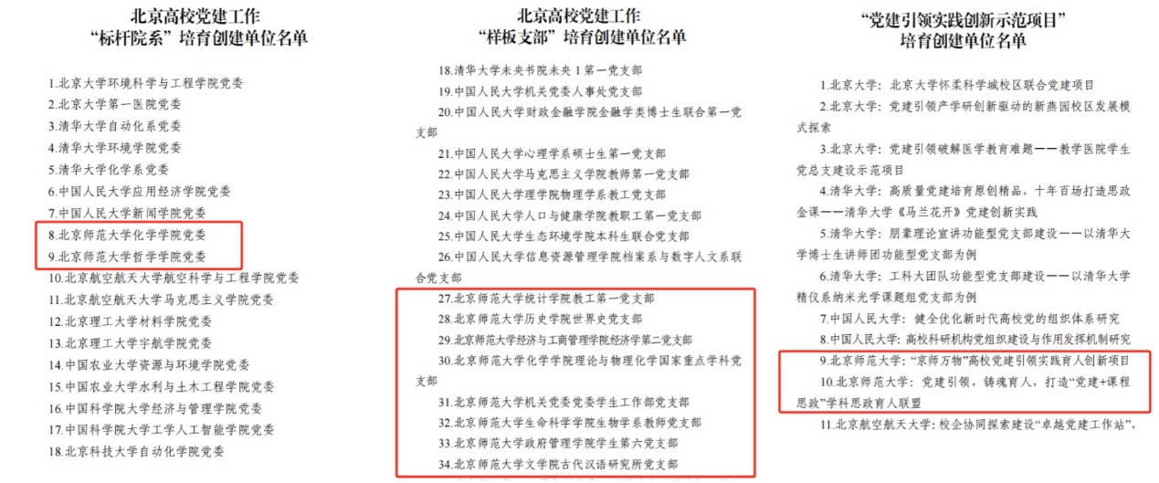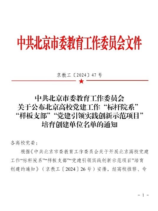 此次遴选是北京市委教育工委组织的首批“双创”培育创建申报。经高校推荐、专家评审、市委教育工委委员会议审议、结果公示等环节,遴选产生了 100 个北京高校党建工作“标杆院系”、300 个北京高校党建工作“样板支部”和 100 个“党建引领实践创新示范项目”。根据北京市委教育工委要求,入选党组织和示范项目将在未来两年开展培育创建工作,并接受中期评估和考核验收。