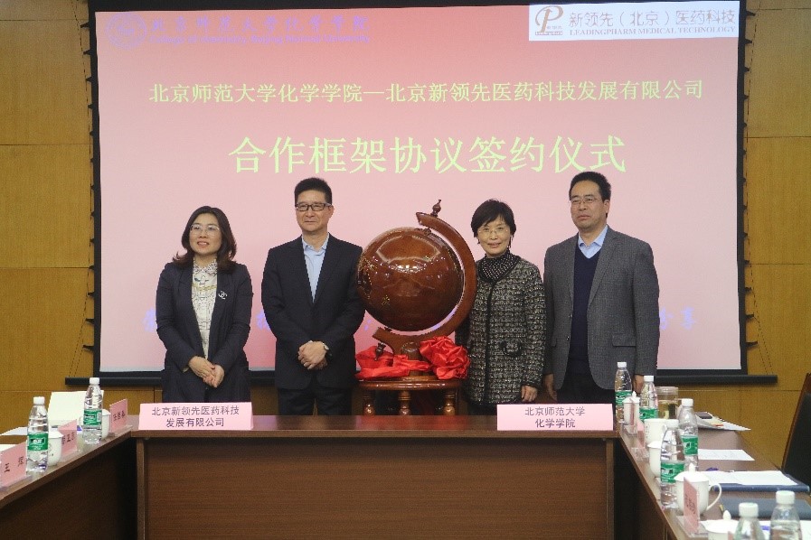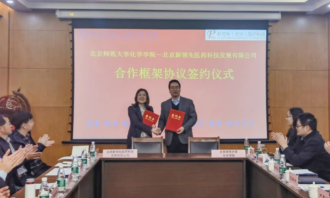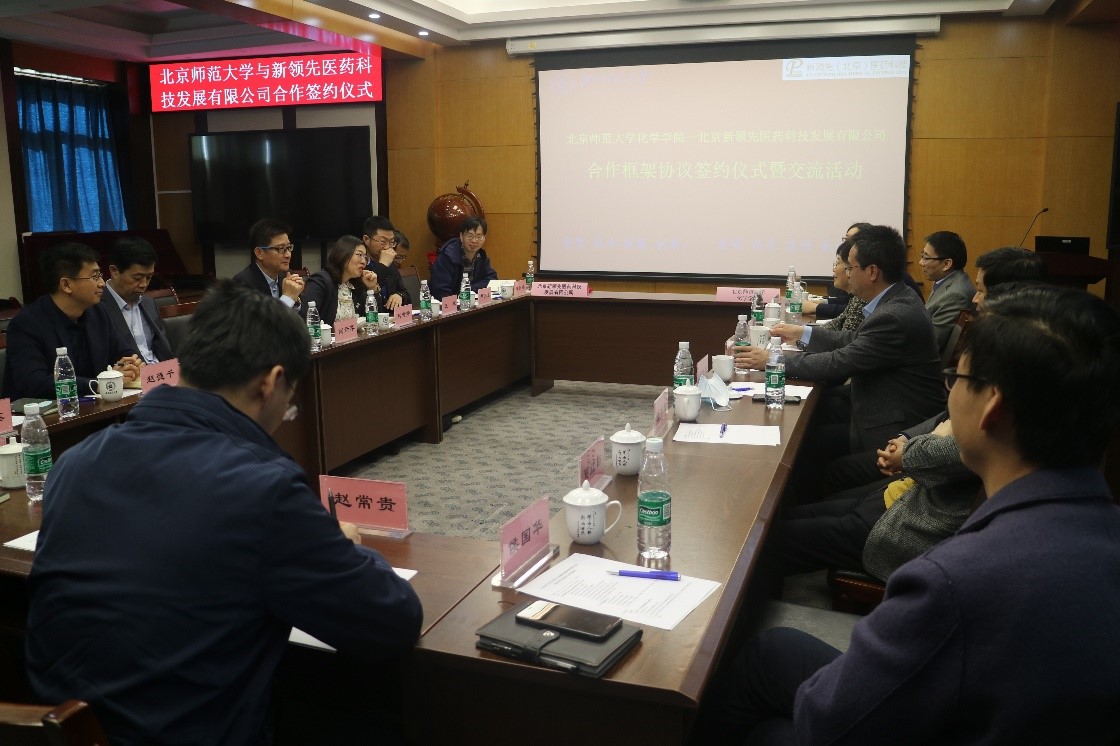 会议由副院长杨清正教授主持,首先范楼珍院长对与会企业领导表示欢迎,并介绍了北师大51动漫 悠久的历史、过硬的科研实力和未来的发展规划,希望在产学研方向进行更深入的合作。她表示与新领先的合作,符合学院学科布局,期待双方携手,实现共赢,取得辉煌的成绩。随后,陶新华董事长致辞,表示北师大以“学为人师,行为世范”为校训,为国家培养了大量优秀的人才,对民族复兴和国家发展起到了积极作用,而新领先作为医药企业,始终坚持“是我,让中国新药技术和生产工艺与世界同步”的愿景,双方都肩负着“健康中国梦”的使命和责任,在此基础上,进行战略合作,是未来发展的选择,希望双方发挥各自优势,共同推动中国医药产业发展。继而,双方在热情和谐的环境下,正式签署了“51动漫 -北京新领先医药科技发展有限公司合作框架协议”。