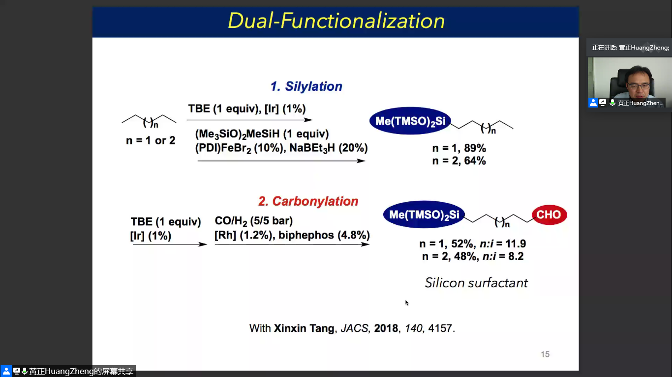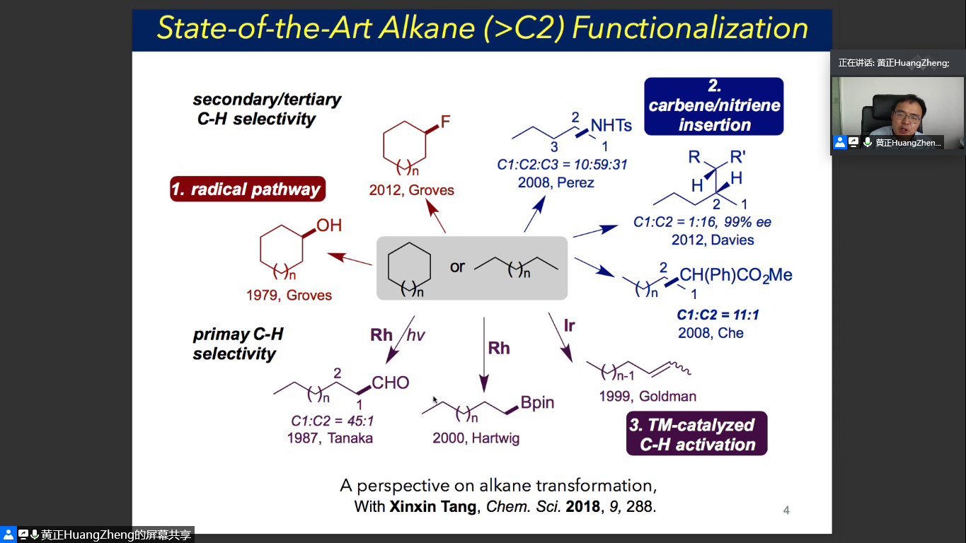 黄正研究员从研究背景入手开始了本次讲座。他指出,利用便捷的方式将烷烃这种廉价的原料转化为具有高附加值的化学品,并在此过程中发展新的有机转化方法学和催化剂等,还面临着动力学、热力学和区域选择性控制等三个方面的挑战。基于上述背景,黄正研究员就以下两个部分展开了讲解,分别是末端选择性的烷烃官能化和聚乙烯的降解。