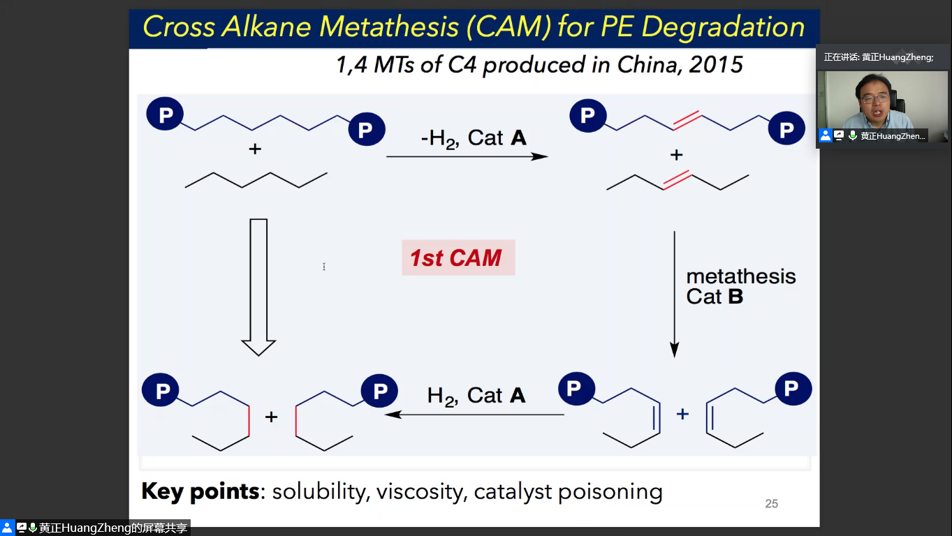 之后,在聚烯烃降解部分,黄正研究员指出,利用温和且选择性的方法催化聚乙烯多次复分解,降解后的聚乙烯可以作为理想燃料。