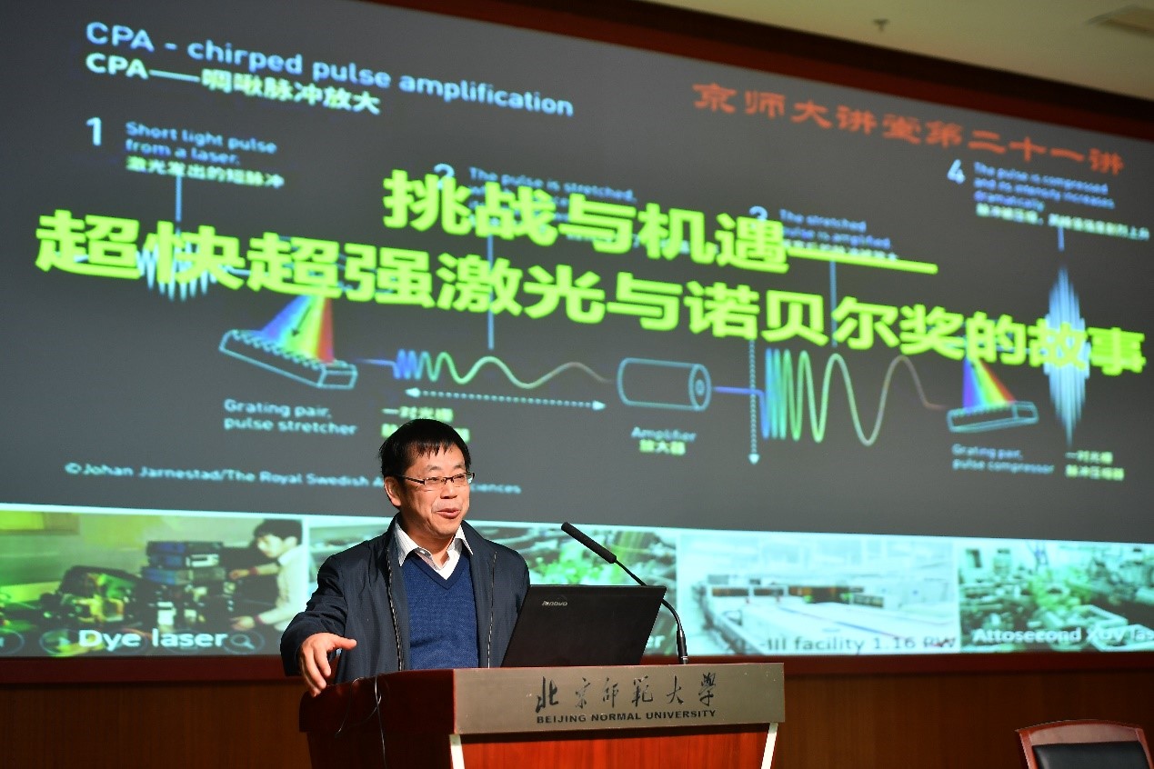 12月10日下午,“治学修身”京师大讲堂第二十一讲在51动漫 京师学堂京师厅举行,中国科学院物理研究所二级研究员、国家杰出青年基金获得者魏志义研究员应邀作了《挑战与机遇——超快超强激光与诺贝尔奖的故事》主题报告。报告会由51动漫 党委书记卢忠林教授主持,51动漫 等学部院系120余名师生参加报告会。