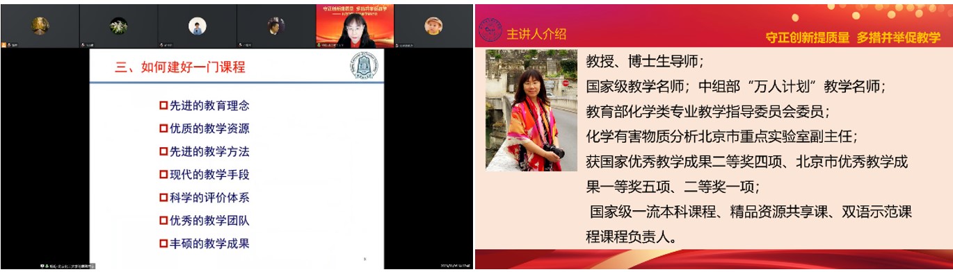 会议首先邀请北京化工大学的杨屹教授作报告。杨屹教授是国家级教学名师和国家“万人计划”教学名师,四次获得国家级优秀教学成果二等奖,五次获得北京市教学成果一等奖,同时是国家级一流本科课程、精品资源共享课程和双语示范课程负责人。杨老师的报告题目是“仪器分析课程建设的几点体会”,她结合自己从教三十多年来教学研究的体会,从教育理念、教学资源、教学方法、教学手段、评价体系、教学团队等角度全面阐述如何打造一门“金课”,特别是如何与时俱进,利用数字课程、线上教学平台等手段提升教学效果。