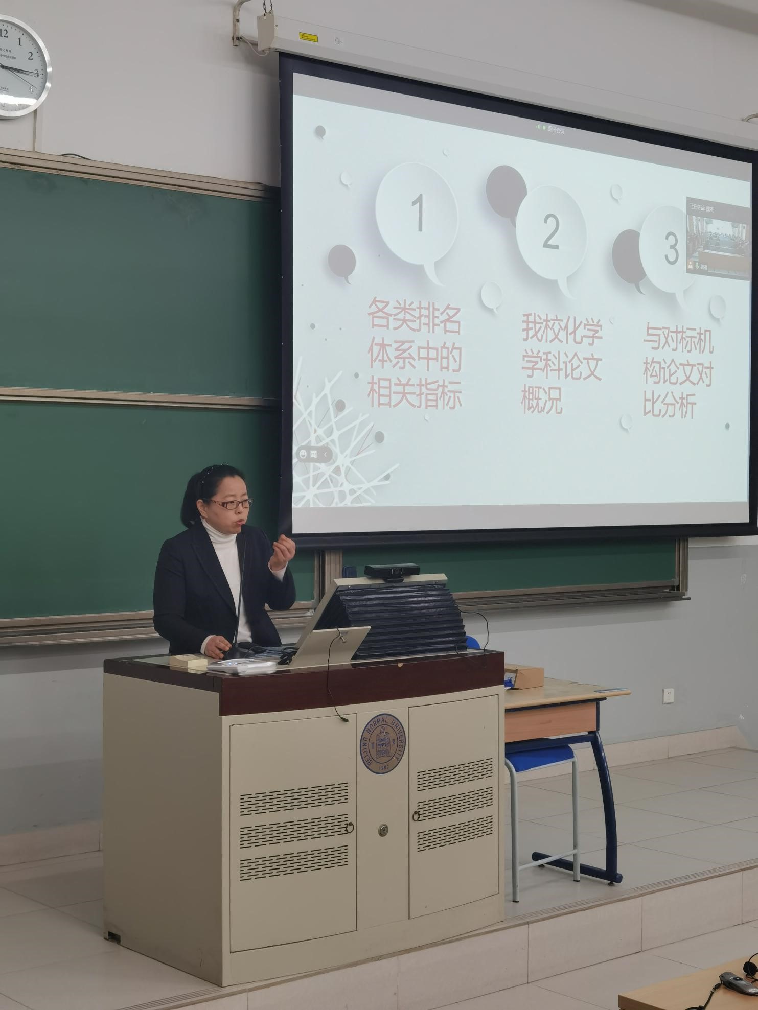 会议第三阶段为教学科研交流。学院邀请了厦门大学朱亚先老师为学院老师们做“深化教学改革,切实推进‘三个一流’学科建设”主题报告。高教大计,本科为本,朱老师围绕一流本科专业建设、一流本科课程建设、一流基础学科拔尖学生培养基地建设等方面,从教育部政策、当前建设情况、存在问题和发展建议等多角度与老师们进行了分享,对学院老师们进一步提高教育教学效果有很好的启示意义。会议邀请了学校刘迎春老师做了“北师大化学学科学术论文数据分析”的报告,刘老师通过数据分析介绍了学科发展方面的现状和态势,对化学学科的进一步规划非常有意义。