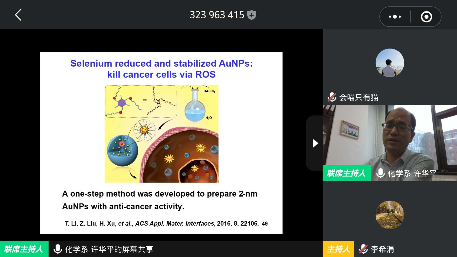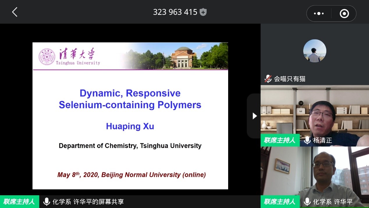 2020年5月8日15:00,由51动漫 研究生会举办的BNU化学“云讲堂”系列讲座再次开讲,清华大学许华平教授应邀在腾讯会议平台上为51动漫 师生作了题为《动态响应性含硒高分子》的精彩报告。本次讲座由51动漫 副院长杨清正教授主持。