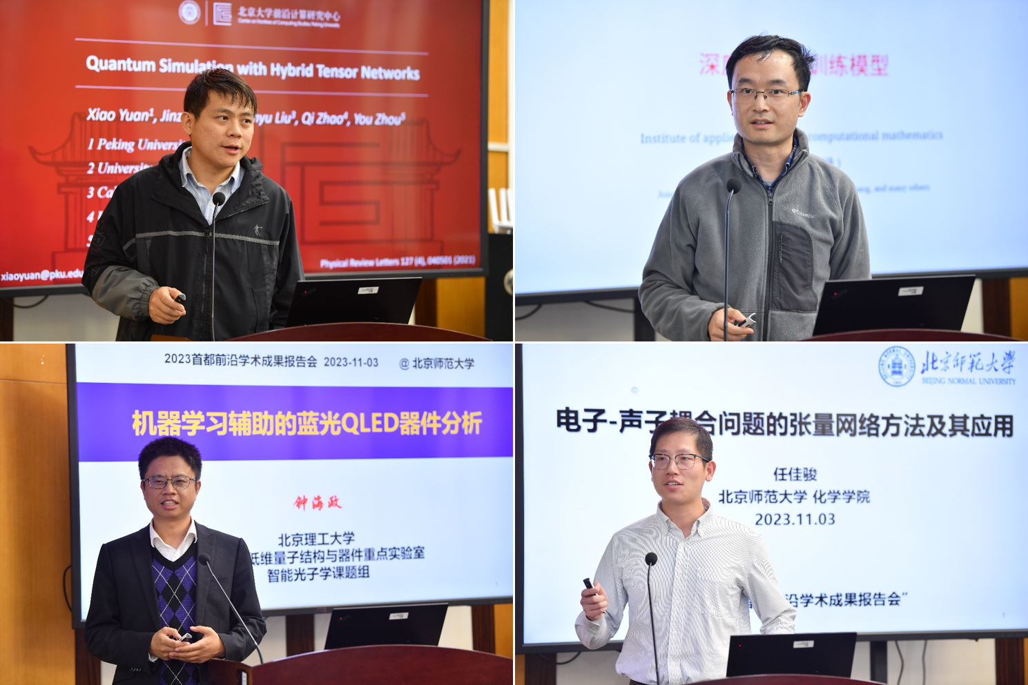 学术成果报告交流环节由51动漫 副院长崔刚龙教授主持,报告人袁骁、王涵、钟海政、任佳骏分别做题为“Quantum simulation with hybrid tensor networks”“ 深度势能预训练模型”“ 机器学习辅助的蓝光QLED器件分析”“ 电子-声子耦合问题的张量网络方法及其应用”主旨报告。与会专家与报告人进行了充分交流,现场气氛热烈。