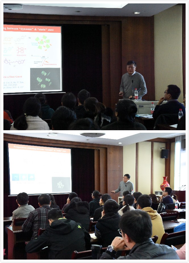 2018年11月22日,华东理工大学田禾院士莅临51动漫 讲学。讲座主要关于分子动态组装与性能调控,制备用于调谐发射颜色的人工动态组装系统方面的最新进展。田禾院士课题组通过一个创新策略,将磷修饰到β-CD来构建无金属的非晶室温磷光(RTP)小分子化合物,这些衍生物具有强烈的RTP发光,该方法具有制备简便、可行性好、通用性强、毒性低、发光强度高、对脱氧和低温无严格要求的优点。另外,田禾院士课题组还发展了一种类似人工肌肉的分子致动器,通过外界刺激,可以实现其线性收缩和伸展运动,并在单分子尺度可逆地控制附近金纳米颗粒的距离,分子的运动同时伴随着由金纳米粒子等离子体共振产生的光信号输出。在提问交流过程中,就师生感兴趣的问题,田禾院士分子对动态组装与性能调控做了概括与解释,田禾院士认为超分子自组装是材料科学中自下而上构建有序纳米结构的有效策略,在生物学应用中已经显示出巨大的潜力。