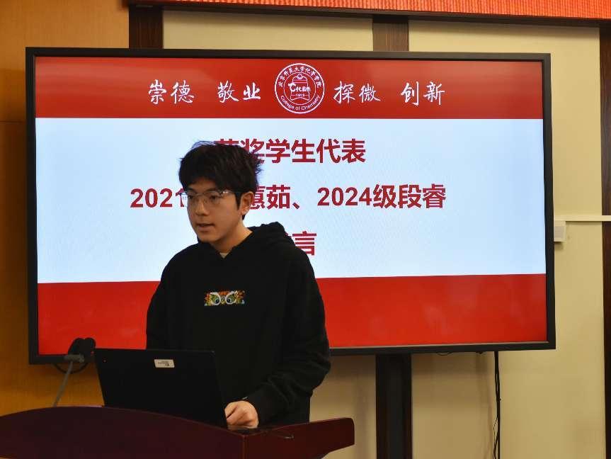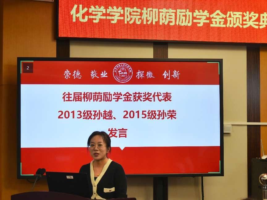 柳荫励学金往届获奖代表、2013级孙越和2015级孙荣分别发言,感谢学院帮助打下了坚实学科基础,表示柳荫励学金已超越了资助本身,是一种荣誉,代表了化院人的一份深情厚谊。柳荫励学金所蕴含的学长学姐们的善意和支持,激励学子们不断前行。