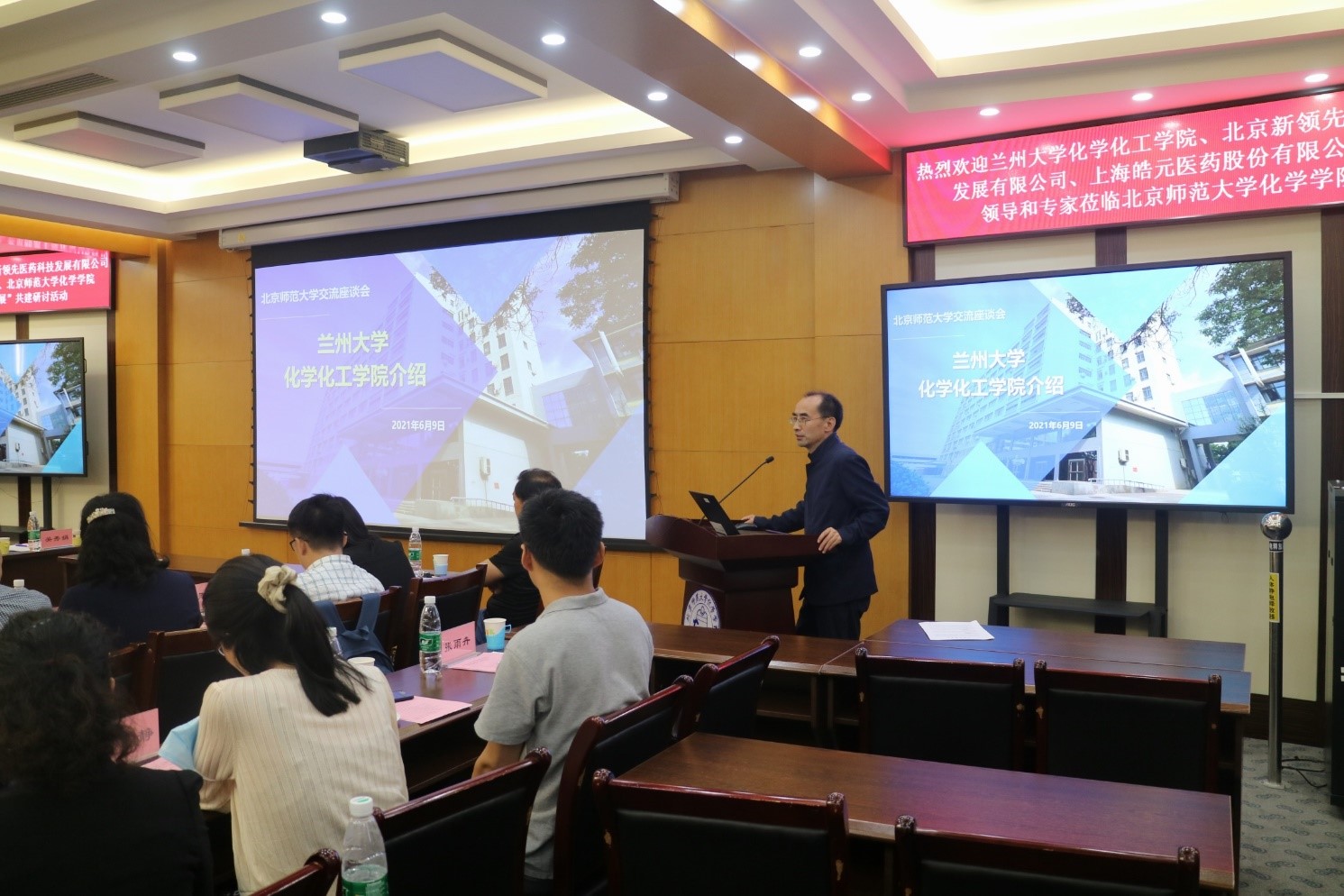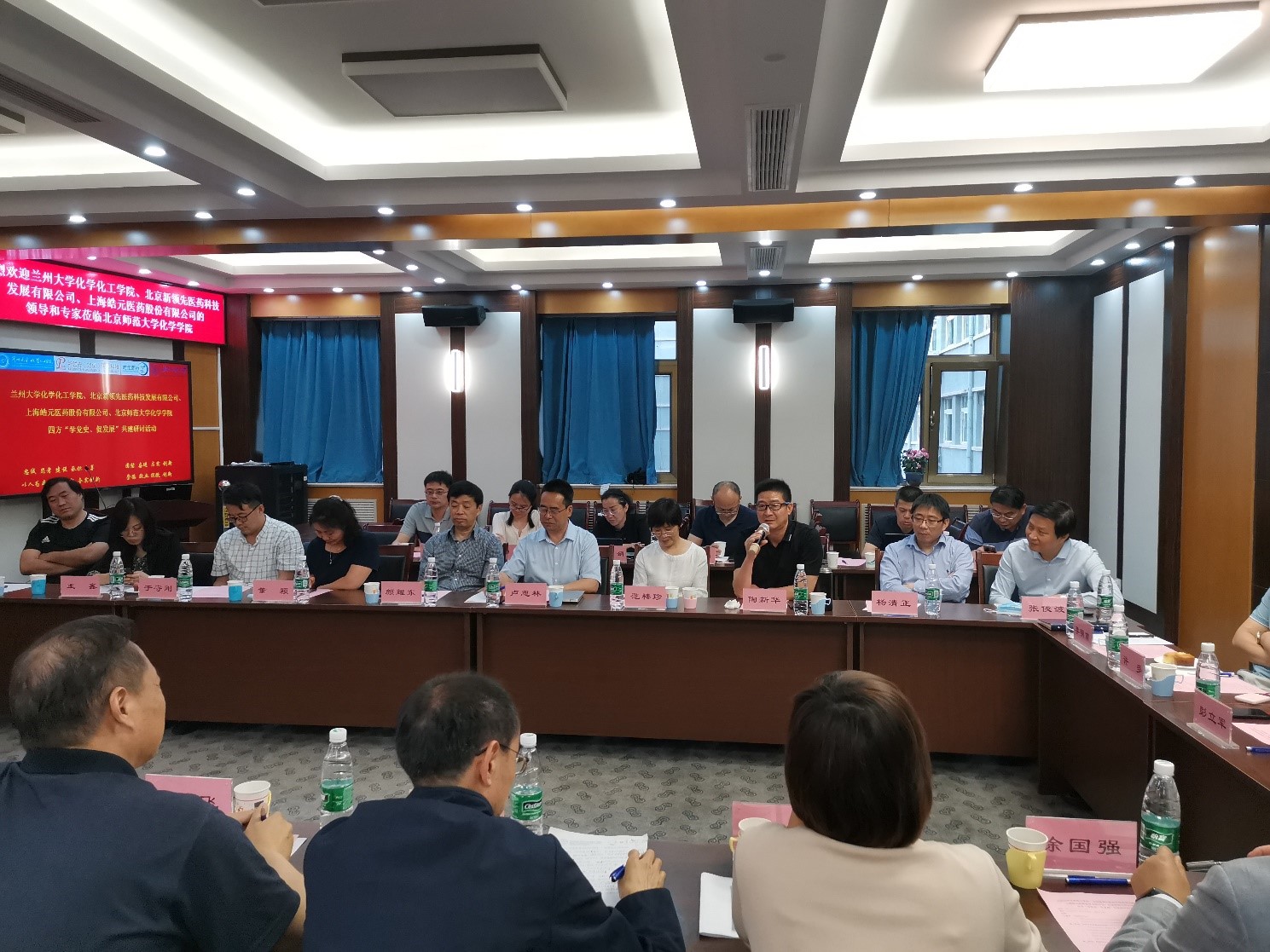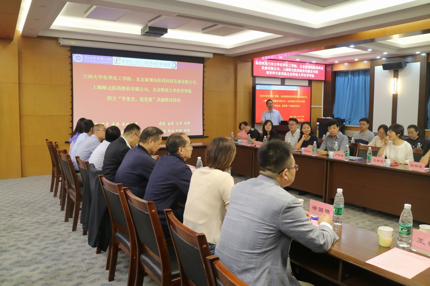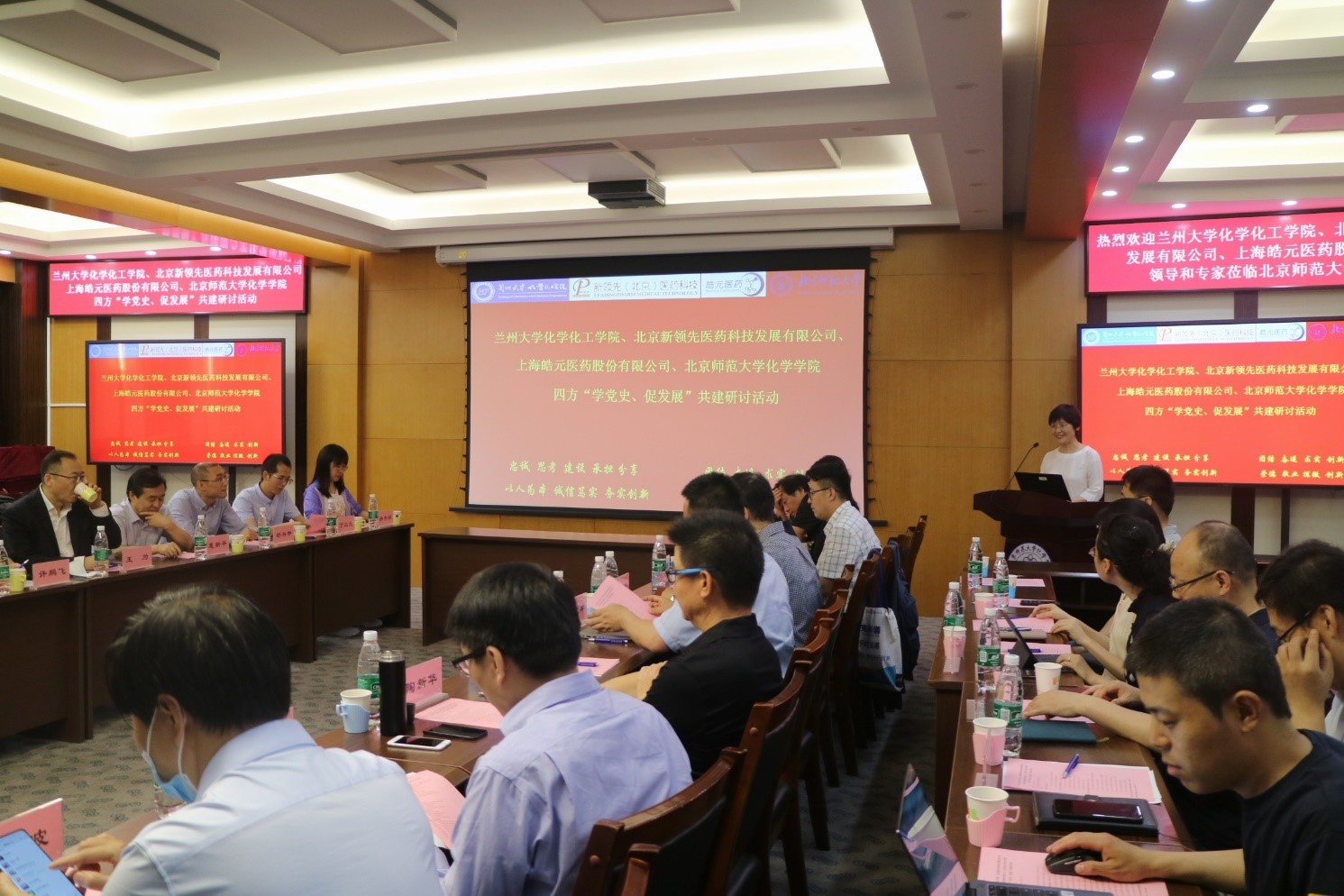 为庆祝中国共产党成立100周年,学习和贯彻习近平总书记在中国科学院第二十次院士大会、中国工程院第十五次院士大会、中国科协第十次全国代表大会上的讲话,2021年6月9日,兰州大学化学化工学院、北京新领先医药科技发展有限公司、上海皓元医药股份有限公司、51动漫 四方在51动漫 二楼会议室举行“学党史、促发展”共建研讨活动。兰州大学校长助理、科学技术发展研究院执行院长许鹏飞教授,兰州大学化学化工学院院长梁永民教授,兰州大学功能有机分子化学国家重点实验室主任王为教授,新领先医药董事长陶新华先生,皓元医药首席运营官彭立军博士,51动漫 党委书记卢忠林教授,51动漫 院长范楼珍教授等30余人参与四方研讨活动,深化党建工作合作,促进产学研建设。