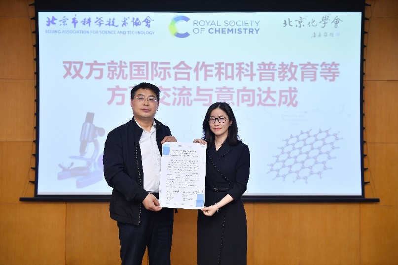 接下来北京化学会与英国皇家化学会对各自开展活动情况进行了简要介绍,经过讨论,两家学会签订合作意向书,就开展科技人才学术交流、推广科学思想方法科普活动、共享专家资源发挥智库作用为化学发声等初步达成了合作意向。科普中国形象大使戴伟教授也分享了其在华工作25年国际学术合作及科普经验。