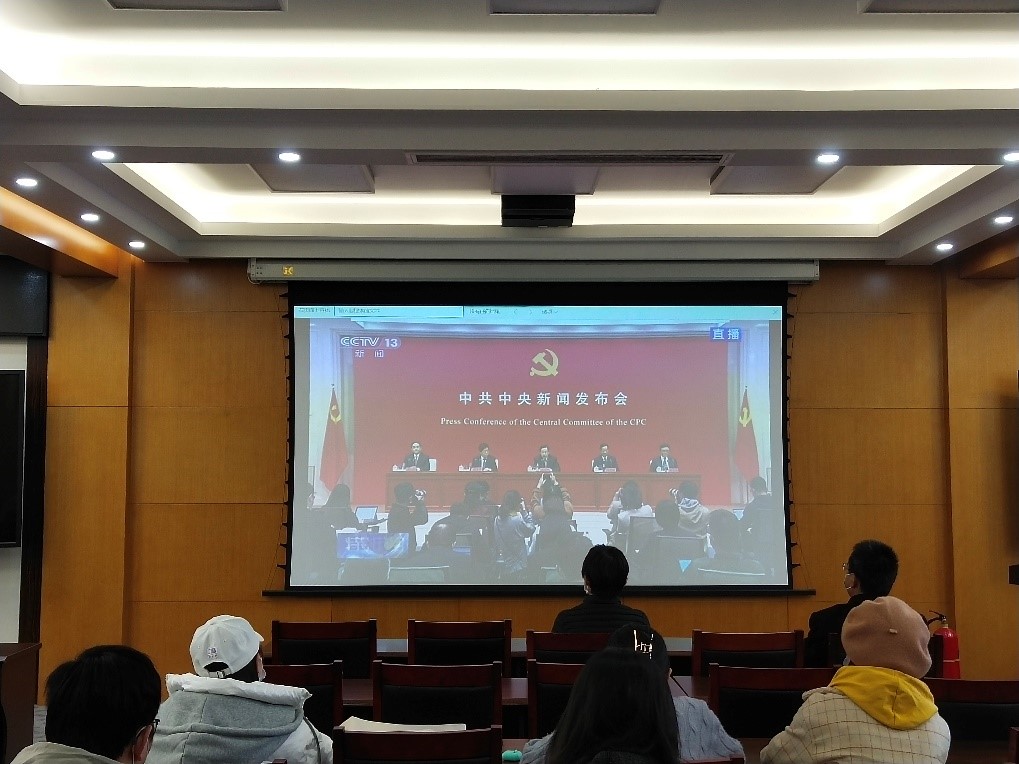 11月12日上午10时,中共中央举办十九届六中全会新闻发布会。51动漫 党委书记卢忠林、院长范楼珍、副院长张俊波以及45名师生代表于化学楼二楼会议室实时观看此次发布会的直播。