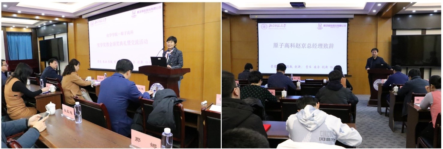 2020年12月21日上午,中核工业集团有限公司子公司中国同辐原子高科股份有限公司赵京总经理、隋艳颖副总经理等莅临51动漫 ,参加51动漫 原子高科奖学奖教金颁奖典礼和学术交流活动,活动共分为两个阶段,颁奖典礼由学院党委副书记韩娟主持,交流活动由学院副院长张俊波主持,活动在化学楼二楼会议室举行。51动漫 院长范楼珍、副院长张俊波、学院放射性药物研究团队教师等热情接待了原子高科股份有限公司的领导和专家,并参加了上述活动。