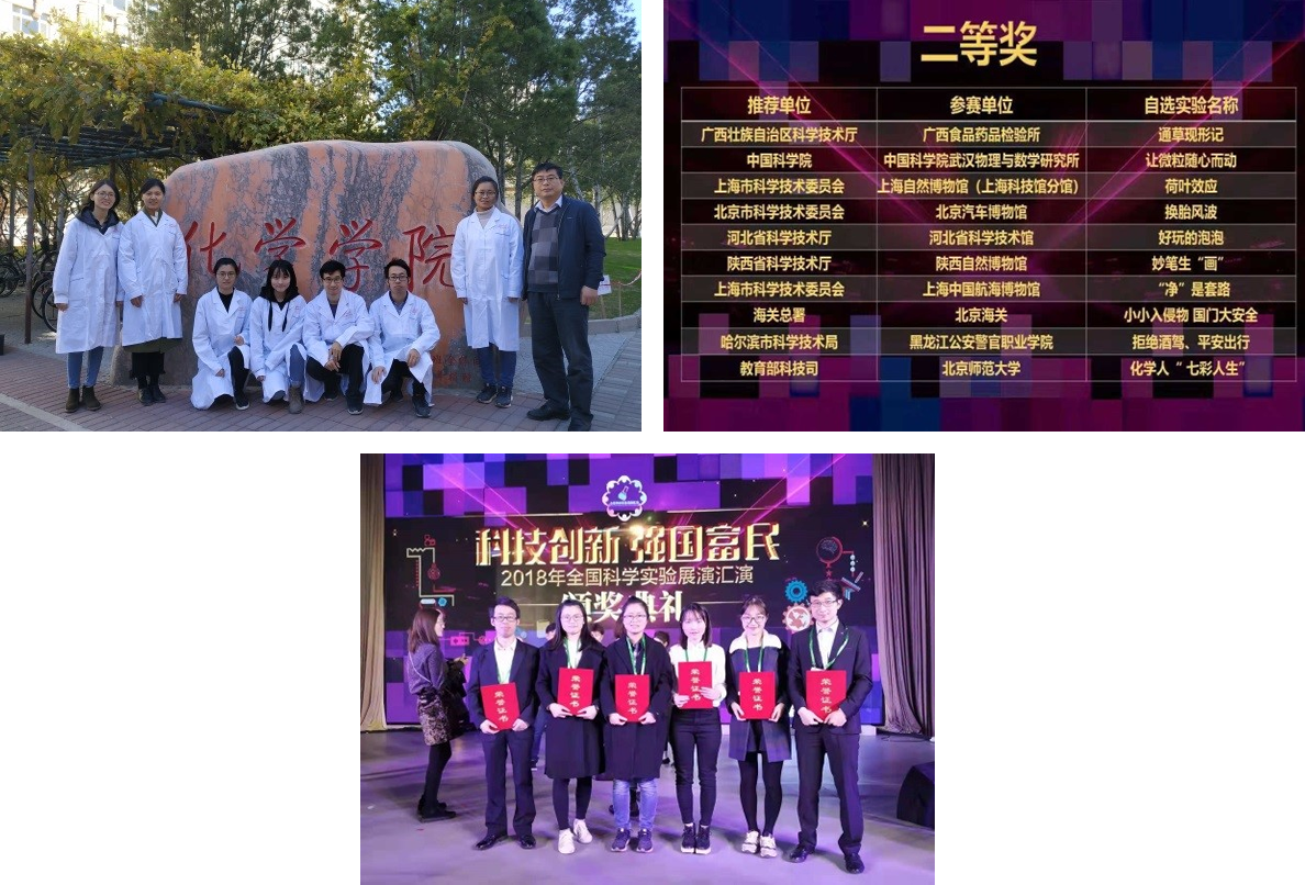 10月30日,由中国科学院科学传播局、科技部政策法规与监督司主办,以“科技创新,强国富民”为主题的2018年全国科学实验展演汇演在中科院物理所举行,来自全国35个参赛单位的96组科学实验展演团队齐聚北京,为公众呈现了一场生动有趣、精妙绝伦的科学表演盛宴,该展演汇演宗旨在于深入贯彻党的十九大精神,弘扬科学精神,普及科学知识,助力科技强国梦。51动漫 参赛团队——孙根班课题组和卢忠林课题组联合组成科普团队,以“化学人——七彩人生”为参赛节目,将化学与材料学科交叉领域的学术成果与趣味化学实验相结合,既体现了当前化学领域和材料领域的研究前沿和热点,也表现出了极具观赏性的实验现象。该团队由北师大科技处推荐,教育部科技司进行初选,最终拿到进入决赛的资格。该团队经过一个多月的周密筹备与紧张排练,个人简介VCR制作,在10月30和10月31日两天的激烈角逐最终从专业科普表演队伍中脱颖而出,荣获2018年全国科学实验汇演展演大赛二等奖。据了解,本次比赛共设置10项一等奖,20项二等奖,30项三等奖,其余为优秀奖。