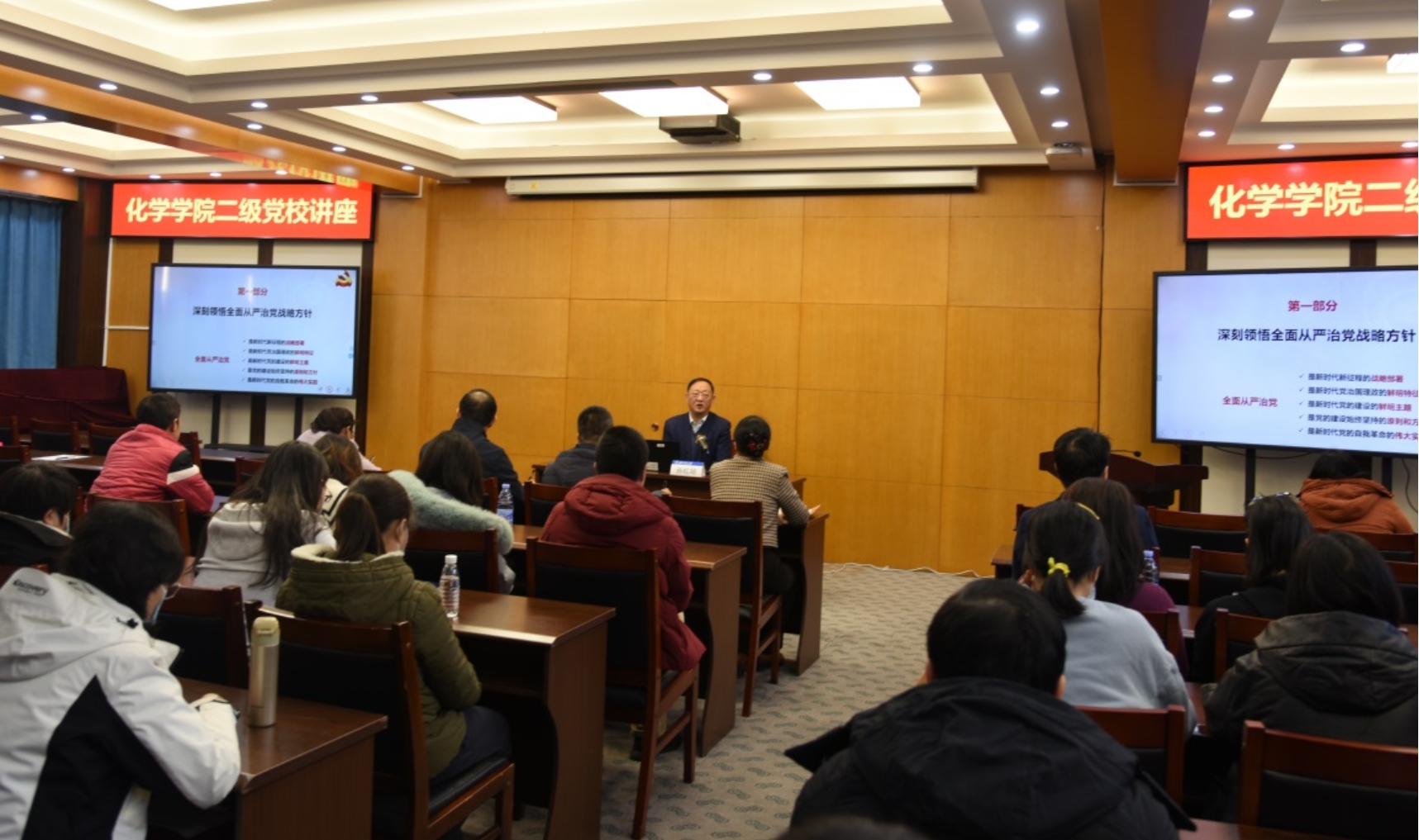孙红培从全面从严治党是党长期坚持的战略方针、全面从严治党是内涵丰富的完整体系、新时代全面从严治党的有效探索三个方面系统阐释了全面从严治党战略方针的核心要义和科学内涵,并聚焦第十四次党代会关于全面从严治党的工作部署,围绕坚守“四有”标准,提出守好政治红线、师德底线、学术戒线、廉洁防线的工作要求。