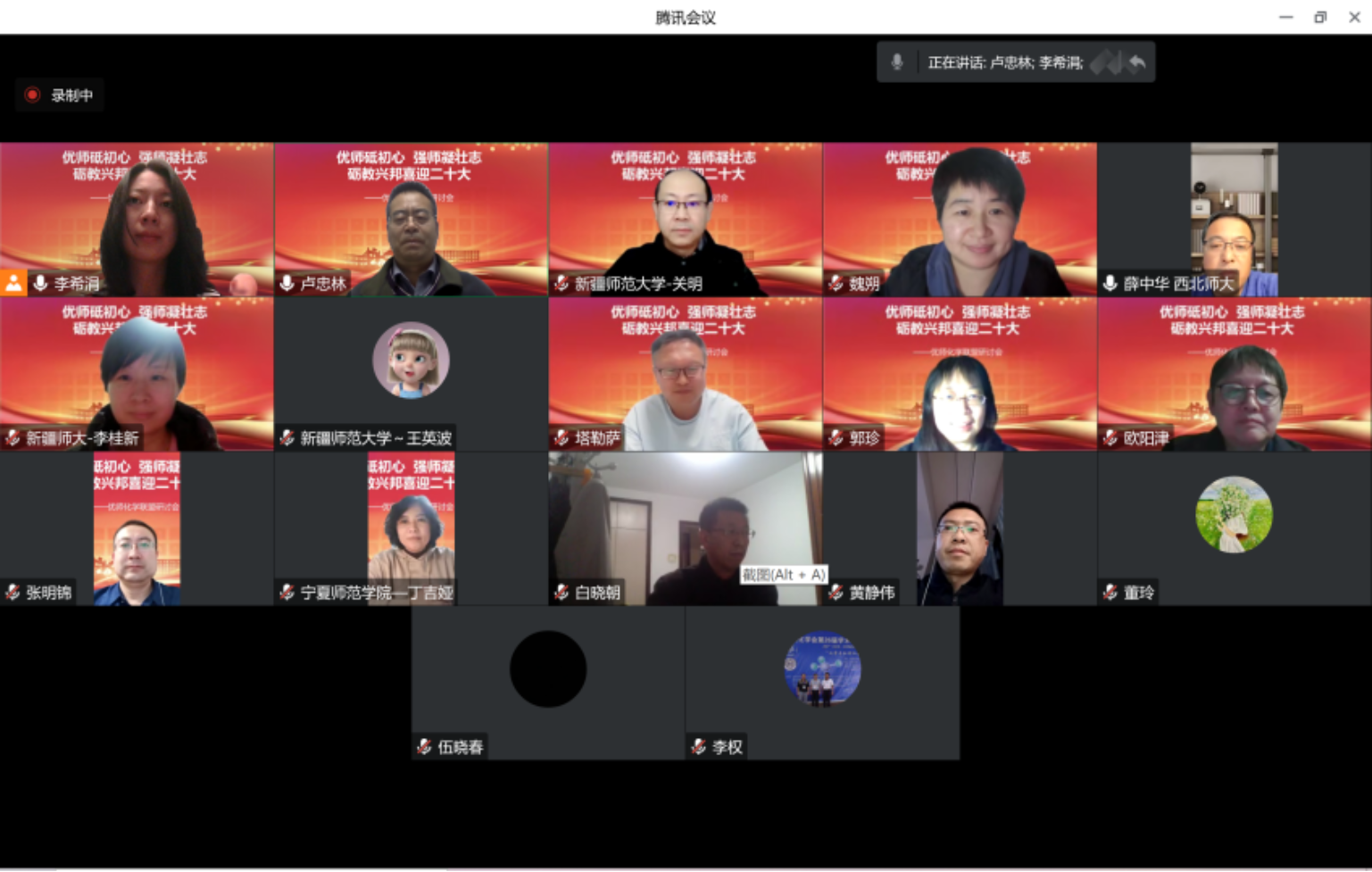 宁夏师范学院丁吉娅和白晓朝老师、青海师范大学郭珍和张明锦老师、西北师范大学薛中华和黄静伟老师、新疆师范大学关明和王英波老师、内蒙古师范大学包永胜和董玲老师、四川师范大学李权和伍晓春老师分别分享了各自院校优师培养方案、经验做法和未来规划,并高度肯定了优师化学联盟成立的意义,表达了对优师化学联盟未来发展的期待, 并表示在北师大化学学科的凝聚下,在优师化学人才的培养之路上不断思考、积聚力量、踔厉奋发,为培养高质量卓越化学优师不懈努力。