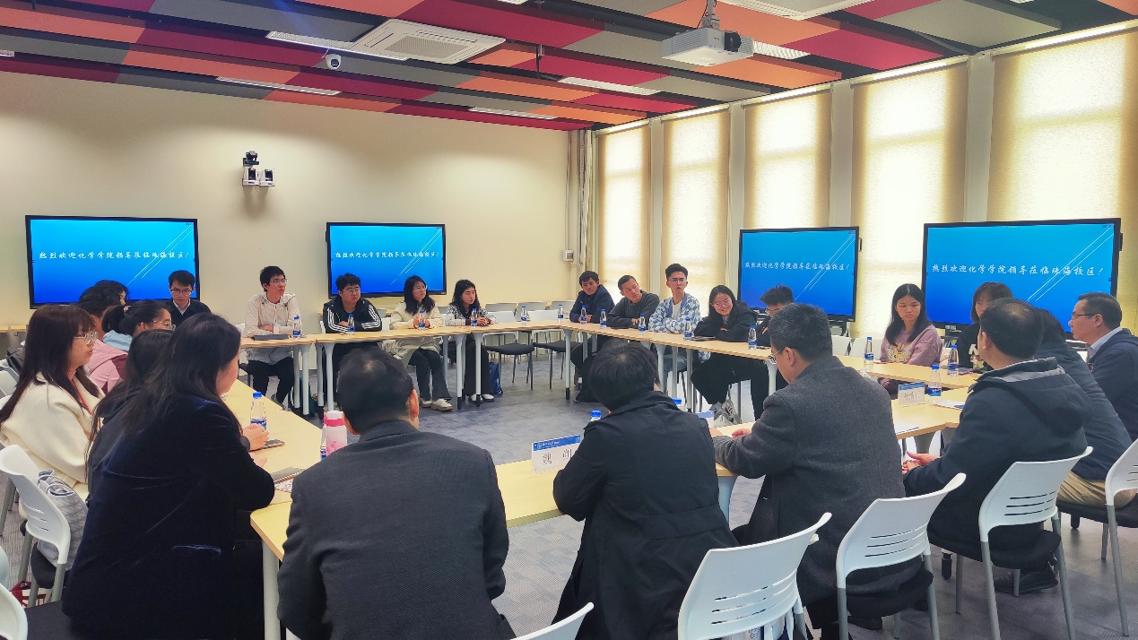在交流环节,现场讨论气氛热烈,同学们收获满满。19级化学班班长朱慧祺提到关于非师范类学生专业实习较少的问题,提出北京校区和珠海校区在设备共享方面的建议;21级化学师范班班长提出关于公费师范生如何在粤港澳大湾区城市中获得竞争力的问题;22级化学师范班长对师范生做科学研究的意义提出困惑,老师们针对学生代表提出的问题和建议都逐一给予详细解答和回复。其中,毛兰群院长指出,做科研的目的是能力的培养和提升,授课同样需要老师能够融会贯通,离不开科研,勉励同学们练好基本功,保持师范生的优势。22级优师计划班学生代表谈到关于学科交叉的问题,对此刘亚军教授结合自身的科研经历做出回应,提到科研本身也是交叉的,化学学科也是如此,鼓励同学们主动学习新知识。