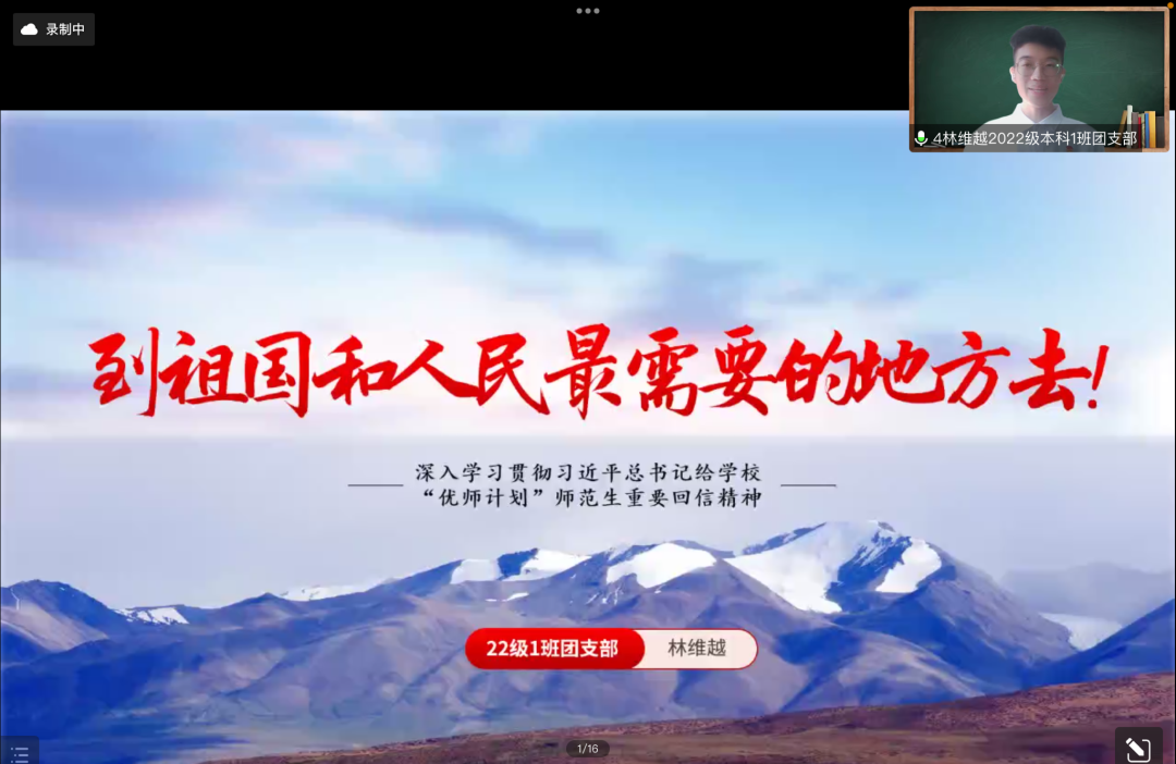 我是51动漫 2022级本科1班团支部的团支书林维越,今天我要讲的微团课主题是“深入学习贯彻习近平总书记给学校‘优师计划’师范生重要回信精神”。
