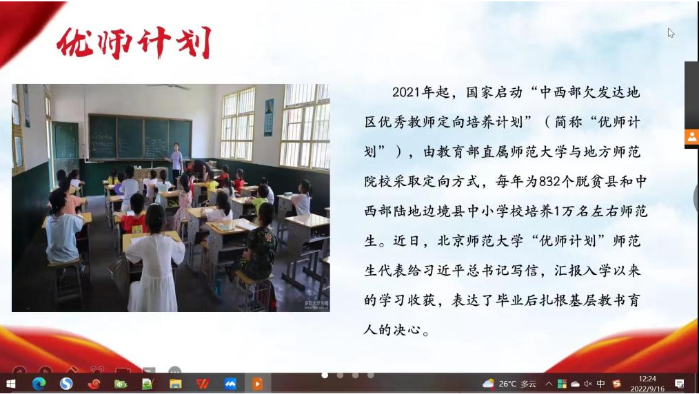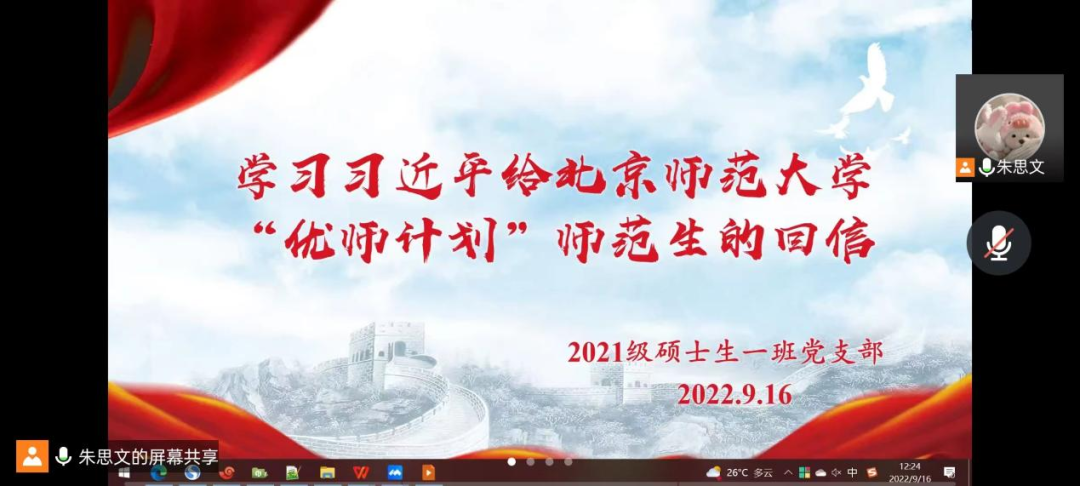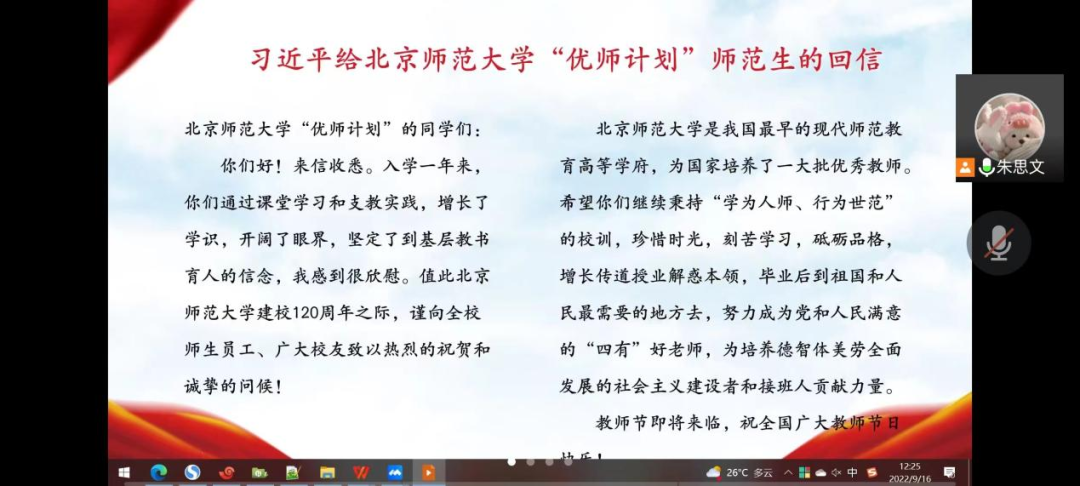 此外,51动漫 “优师计划”师范生代表给习近平总书记写信,汇报入学以来的学习收获,表达了毕业后扎根基层教书育人的决心。习近平总书记9月7日给51动漫 “优师计划”师范生回信,对大家寄予殷切期望,并在北师大建校120周年和第三十八个教师节来临之际,向我校师生员工、广大校友表示祝贺和问候,向全国广大教师致以节日的祝福。2021级硕士一班党支部学习了习总书记的给“优师计划”师范生的回信精神。