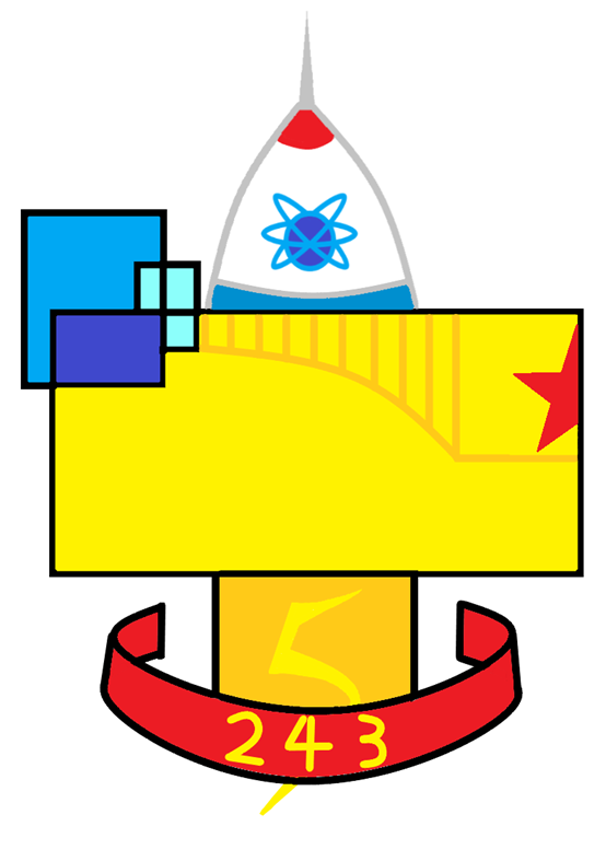 闪电状的数字5、红色的丝带、勋章花纹与红星象征着对于革命思想与精神的继承;画面主体的锤子既代表着工人阶级,又代表先进的生产力;饰有原子符号的火箭象征着先进的科技与不断探索宇宙和微观世界的决心。总体则是先进思想、先进科学技术、先进生产力与先进阶级的综合。一言以蔽之:综合发展,继往开来。
