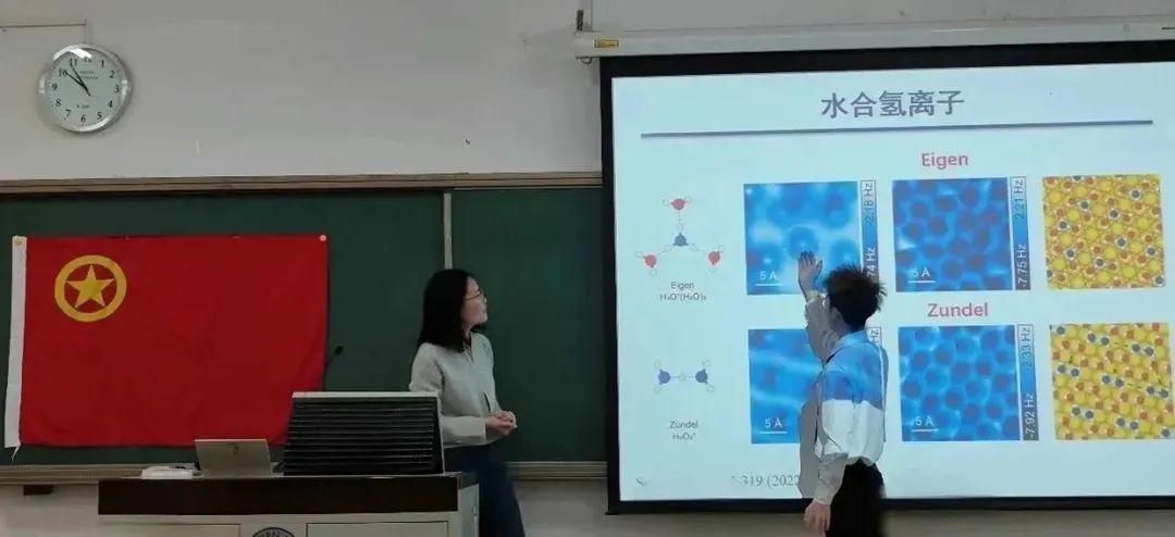 接着,郭静老师向同学们展示了二维冰的不同结构,介绍了二维冰在电池、生物体中都起到了重要的作用,展示了她所在课题组“看”到的水合氢离子的图片,并邀请同学上台辨认水合氢离子的结构。