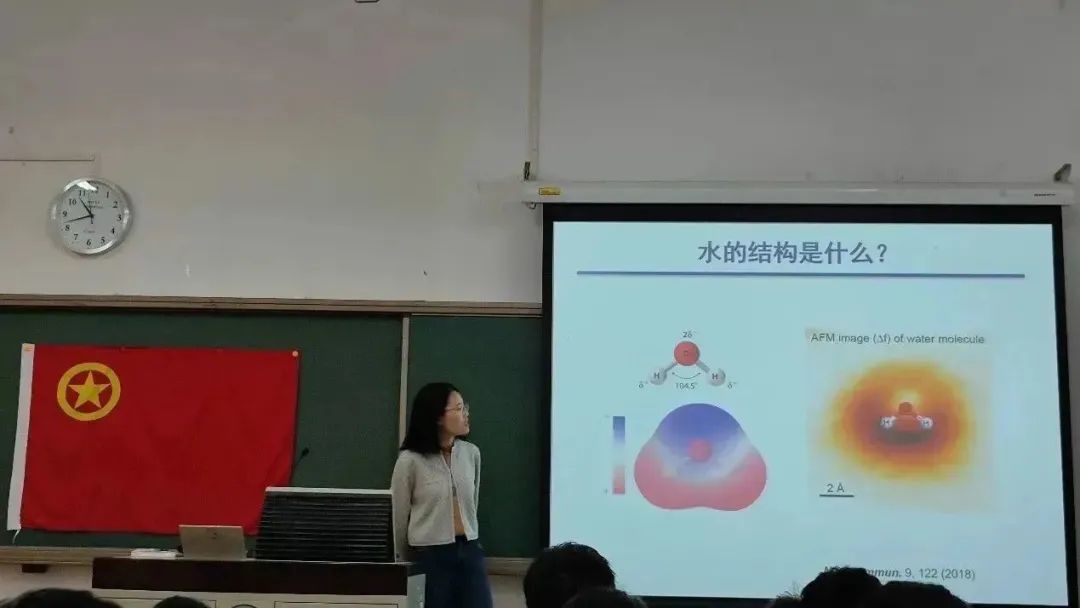 随后,郭静老师以“扫描探针显微镜”为起点,向同学们讲解了关于水分子表面化学的研究。郭老师简单地讲解了扫描探针显微镜的工作原理,生动地将位势垒、穿过位势垒比作“山”和“穿过隧道”,激起了同学们对水分子表面化学研究的强烈兴趣,并且用图示展示了水分子在水和冰不同状态下的不同排列状态,通过提问的方式,与同学进行了交流互动,进一步详细地讲解了不同状态的形成原因。在同学们对于水分子结构有一定认识的基础上,郭静老师进一步讲解了原子力显微镜技术——通过静电力来“看”水分子的结构。