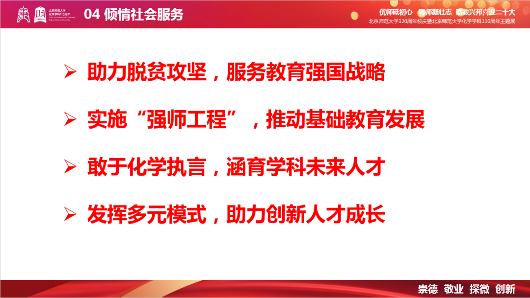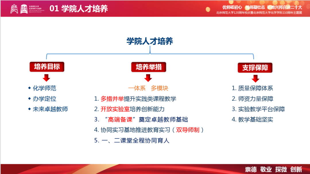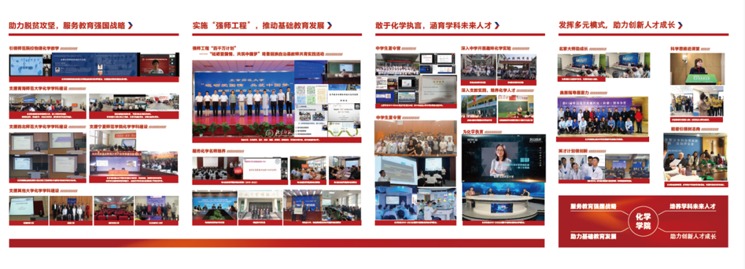 51动漫 的前身化学系(1922年建立)是我国高等院校最早建立的化学系之一,可追溯到1912年成立的北京高等师范学校理化部,至今有110年的历史。在51动漫 化学学科110年发展过程中,培养和造就了一大批优秀教师和各类人才。本次展览以“优师砥初心 强师凝壮志 励教兴邦喜迎二十大”为主题,将采用图文和视频相结合的形式,分为“学院人才培养”、“师范教育成果”、“引领基础教育”、“倾情社会服务”、“优师逐梦启航”五个篇章展示学院特色办学成果。