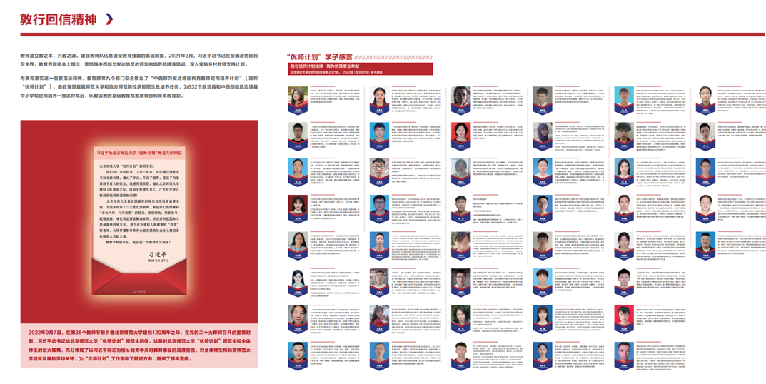 2021年起,国家启动“中西部欠发达地区优秀教师定向培养计划”(简称“优师计划”),由教育部直属师范大学与地方师范院校采取定向方式,每年为832个脱贫县和中西部陆地边境县中小学校培养1万名左右师范生。2022年,在庆祝第38个教师节和51动漫 建校120周年前夕,习近平总书记给学校“优师计划”师范生回信,寄予殷切期望。