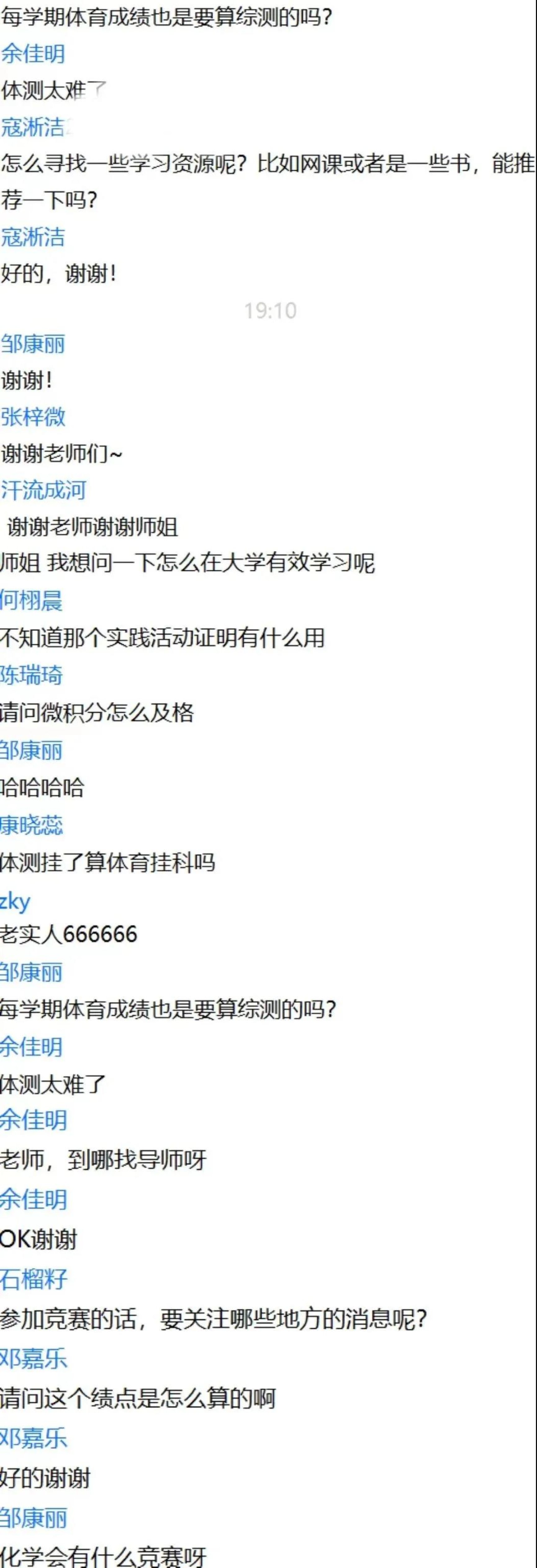 随后,同学们对自己疑惑的地方积极提问,包括如何计算成绩、怎样联系导师等问题。沈晓彤老师和张花蕊师姐针对这些问题进行了耐心的解答。