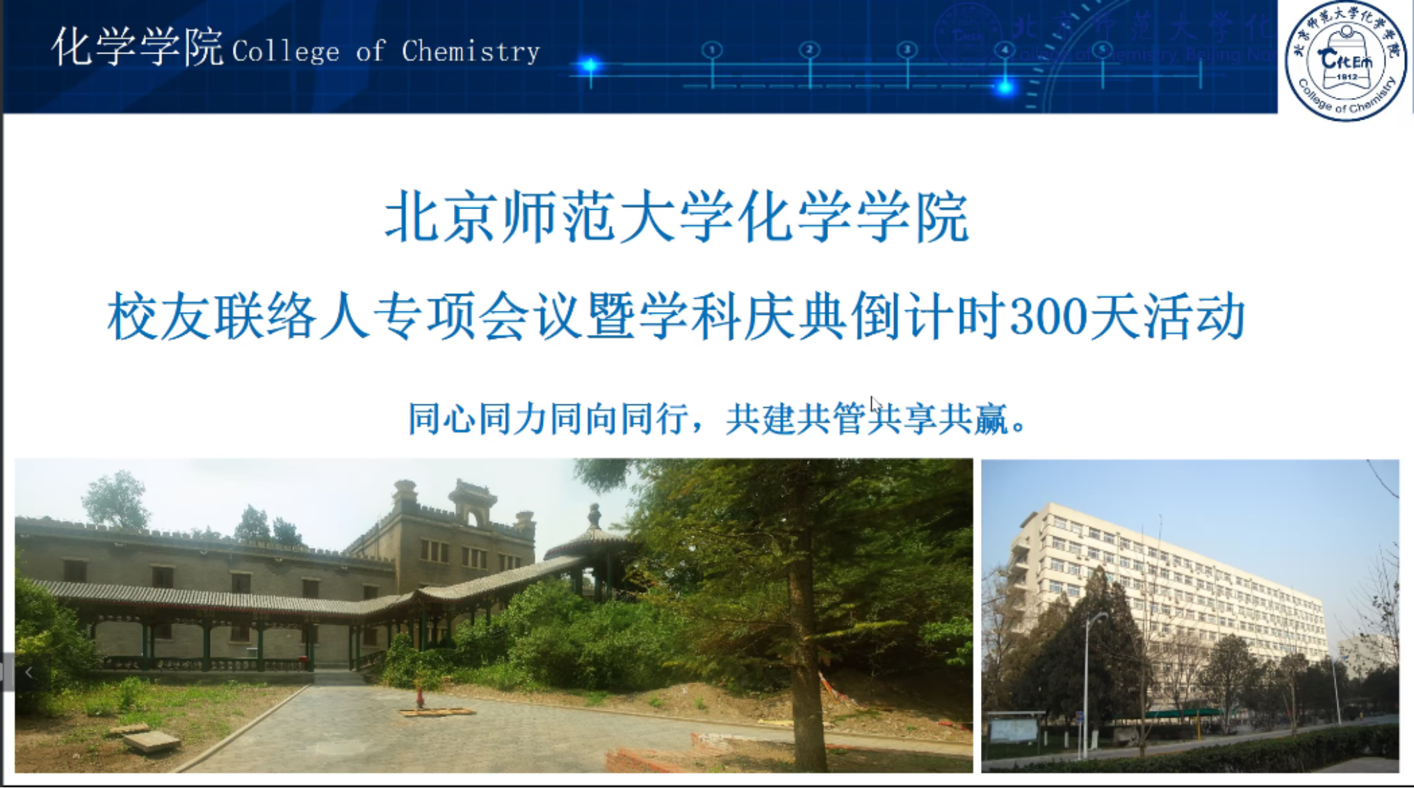 学院院长范楼珍老师代表学院以“百年化学院,桃李竞芬芳”为题,从学院历史沿革、师资力量、教学成就、科研平台和成果、产学研工作等多方面介绍了学院发展情况,表示学院灿烂的成就是由校友们谱写的,未来的发展依然需要包括所有校友在内的北师大化学人同心同德努力奋斗,期待未来能在线下与校友们畅叙情谊,共商发展。